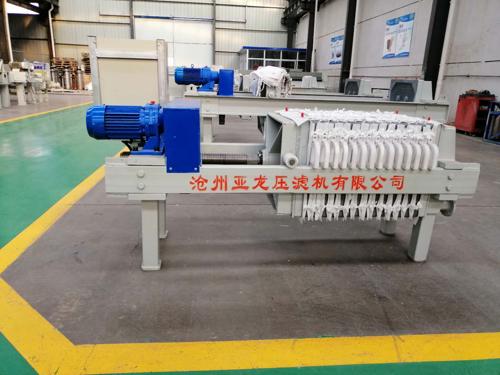 2、機械壓緊:壓緊機構由電動機(配置過載保護器)減速器、齒輪付、絲桿和固定螺母組成。壓緊時,電動機正轉,帶動減速器、齒輪付,使絲桿在固定絲母中轉動,推動壓緊板將濾板、濾框壓緊。當壓緊力越來越大時,電機負載電流大,當大到保護器設定的電流值時,達到壓緊力,電機切斷電源,停止轉動,由于絲桿和固定絲母有可靠的自鎖螺旋角,能可靠地 保工作過程中的壓緊狀態,退回時,電機反轉,當壓緊板上的壓塊,觸壓到行程開關時退回停止。